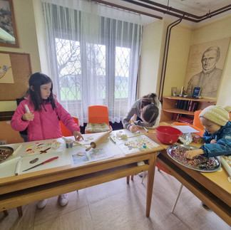 Otroci so po končani spovedi v veroučni učilnici z g. Vladom in animatorko Leono izdelovali velikonočne okraske iz slanega testa, na pomoč pa sta jim priskočili birmanki Neja in Pia.