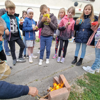 Na koncu smo se zbrali zunaj ob ognju in zažgali listke z grehi, ki so jih otroci po spovedi odložili v košarico. V prijetnem vzdušju smo ob čaju in kolačkih ter kavi za starše zaključili prijetno dopoldansko druženje.